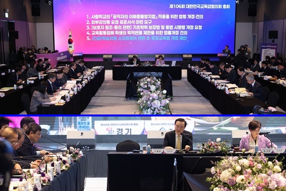 ÀÓÅÂÈñ °æ±âµµ±³À°°¨(¿À¸¥ÂÊ)°ú °­ÀºÈñ ´ëÇѹα¹±³À°°¨ÇùÀÇȸÀå(´ë±¸±¤¿ª½Ã±³À°°¨)¾Æ 29ÀÏ ¼º³² ´õºíÆ®¸® ¹ÙÀÌ Èúư ¼­¿ï ÆÇ±³ ±×·£µåº¼·ë¿¡¼­ ¿­¸° ´ëÇѹα¹±³À°°¨ÇùÀÇȸ Á¦106ȸ ÃÑȸ¿¡¼­ Â÷´ãȸ¸¦ °®°í ÀÖ´Ù.(»çÁø= °æ±âµµ±³À°Ã» Á¦°ø)