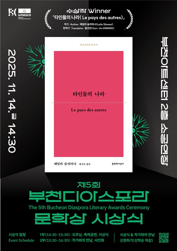 ºÎõ½Ã´Â ¡®2025³â Á¦5ȸ ºÎõµð¾Æ½ºÆ÷¶ó¹®ÇÐ»ó¡¯ ¼ö»óÀÛÀ¸·Î ¸ð·ÎÄÚ ·¹ÀÏ¶ó ½½¸®¸¶´Ï(Leila Slimani) ÀÛ°¡ÀÇ ¡®Å¸ÀεéÀÇ ³ª¶ó(Le pays des autres)¡¯¸¦ ¼±Á¤Çß´Ù°í 22ÀÏ ¹àÇû´Ù.
