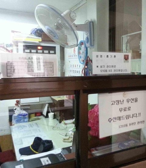 ¾ÆÆÄÆ®°æºñ¿øÀ¸·Î ÀÏÇÏ´Â È«±âÈÆ ¾¾(¿À¸¥ÂÊ)°¡ °íÀåÀÌ ³ª¼ ¹ö·ÁÁø ¿ì»êÀ» ¼ö¸®ÇØ Àü´ÞÇϰí ÀÖ´Ù.