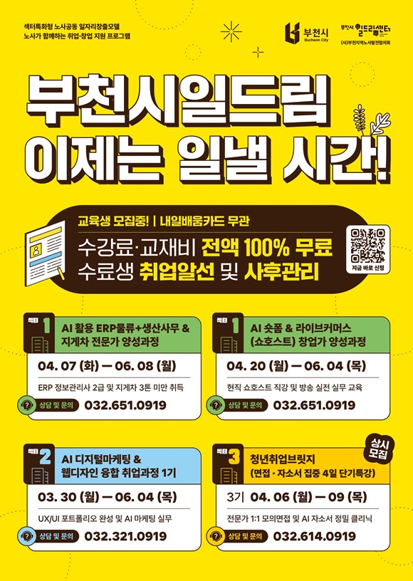 ÇÑÆí, ºÎõ½ÃÀϵ帲¼¾ÅÍ´Â ¡ã5¿ù û³â ½Ãµ¿ ÇÁ·Î±×·¥, ¡ã6¿ù Ãë¾÷¿¬°èÇü AI Ȱ¿ë Àü»êȸ°è¡¤¿ÀÅäijµå ´Ù±â´É °úÁ¤, ¡ã7¿ù AIÀ¶ÇÕ E-Ä¿¸Ó½º â¾÷°¡ ¾ç¼º °úÁ¤ µî ´Ù¾çÇÑ Ã롤â¾÷ ÇÁ·Î±×·¥À» ¼øÂ÷ÀûÀ¸·Î ¿î¿µÇÒ °èȹÀÌ´Ù. ½Åû ¹æ¹ý°ú ±³À° ÀÏÁ¤ µî ÀÚ¼¼ÇÑ »çÇ×Àº ºÎõ½ÃÀϵ帲¼¾ÅÍ È¨ÆäÀÌÁö(www.dreamwork.or.kr¤ý¹Ù·Î °¡±â Ŭ¸¯)¿¡¼ È®ÀÎÇÒ ¼ö ÀÖ´Ù.