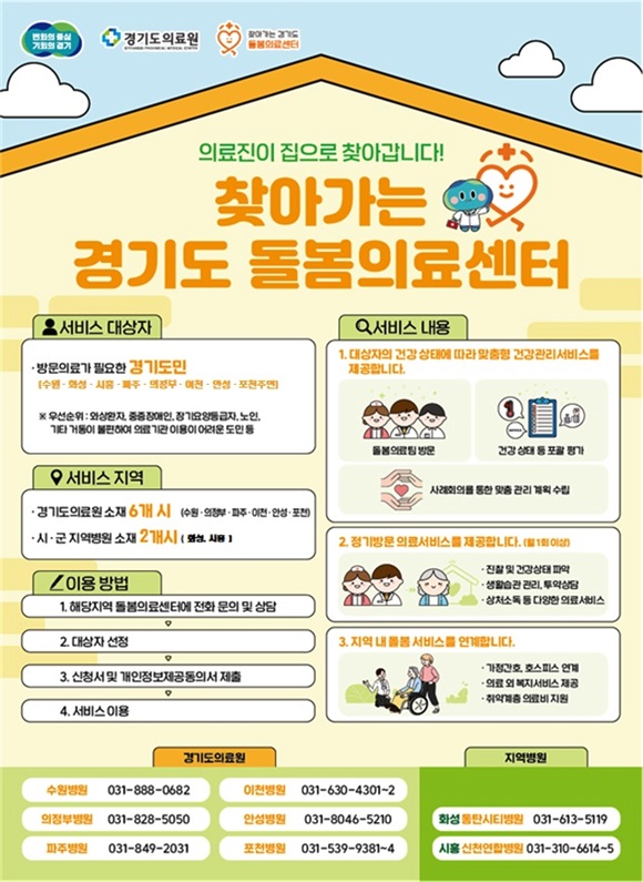 °æ±âµµ°¡ 9¿ù 30ÀϺÎÅÍ 10¿ù 28ÀϱîÁö °æ±âµµÀÇ·á¿ø »êÇÏ 5°³ º´¿ø¿¡¼­ ¡®Ã£¾Æ°¡´Â °æ±âµµ µ¹º½ÀÇ·á¼¾ÅÍ¡¯ ºñÀü ¼±Æ÷½ÄÀ» ¿­°í, µµ¹ÎÀÌ Áý¿¡¼­µµ °Ç°­ÇÏ°Ô Áö³¾ ¼ö ÀÖ´Â µ¹º½ÀÇ·áÀÇ »õ·Î¿î µµ¾àÀ» ¼±¾ðÇÑ´Ù.