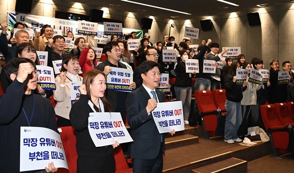 ¡®¸·Àå À¯Æ©ºê µî ¹®Á¦¼º 1ÀÎ ¹Ìµð¾î ´ëÀÀ ½Ã¹Î ¸ð´ÏÅ͸µ´Ü¡¯ ¹ß´ë½Ä¿¡¼­ Á¶¿ëÀÍ ºÎõ½ÃÀå, ±èº´Àü ºÎõ½ÃÀÇȸ ÀÇÀåÀ» ºñ·ÔÇÑ ½Ã¹Î ¸ð´ÏÅ͸µ´Ü µî Âü¼®ÀÚµéÀÌ ¡®¸·Àå À¯Æ©¹ö ±ÙÀý¡¯À» À§ÇÑ ¸Þ½ÃÁö Ä«µå¸¦ µé°í ±¸È£¸¦ ¿ÜÄ¡°í ÀÖ´Ù.(»çÁø= ºÎõ½Ã Á¦°ø)