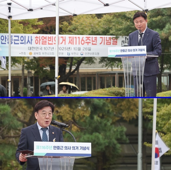 Á¶¿ëÀÍ ºÎõ½ÃÀåÀÌ 26ÀÏ ¿¸° ¡®¾ÈÁß±Ù ÀÇ»ç ÀǰŠÁ¦116Áֳ⠱â³ä½Ä¡¯¿¡¼ ±â³ä»ç¸¦ Çϰí ÀÖ´Ù. ¾Æ·¡´Â ÀåÇз¡ ±¤º¹È¸ ºÎõ½ÃÁöȸÀåÀÌ ¾ÈÁß±Ù ÀÇ»ç ¾àÀü º¸°í¸¦ Çϰí ÀÖ´Ù.(»çÁø= ºÎõ½Ã Á¦°ø)