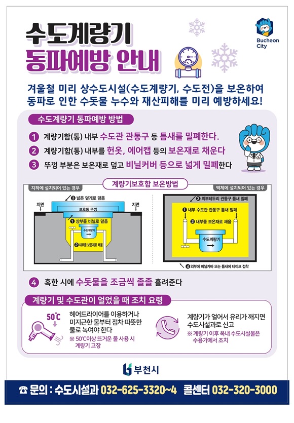 ÇÑÆí, ºÎõ½Ã´Â ¼öµµ°è·®±â µ¿ÆÄ°¡ ±Þ°ÝÇÑ ±â¿Â °­ÇÏ¿¡ ¹Î°¨ÇÏ°Ô ¹ß»ýÇÏ´Â °ü°è·Î ½Ã¹ÎÀÇ ÀÚÀ²ÀûÀÎ ¿¹¹æ ³ë·ÂÀÌ ¹«¾ùº¸´Ù Áß¿äÇÑ ¸¸Å­ °è·®±â º¸¿Â ¹æ¹ý, µ¿ÆÄ ¿¹¹æ¹ý, µ¿°á ½Ã Á¶Ä¡ ¿ä·É µîÀ» ³Î¸® ¾Ë¸®´Â È«º¸¸¦ º´ÇàÇϰí ÀÖ´Ù.