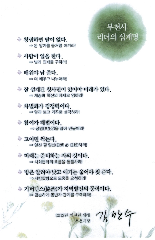 ±è¸¸¼ö ºÎõ½ÃÀåÀÌ 2011³âÀ» ¸¶¹«¸®ÇÏ´Â ½ÃÁ¡¿¡¼­ °úÀå±Þ ÀÌ»ó °£ºÎ°ø¹«¿ø 110¸í¿¡°Ô ÇÑ ±ÇÀÇ Ã¥À» ¼±¹°Çß´Ù. ±è ½ÃÀåÀÌ ¼±¹°ÇÑ Ã¥Àº ·ù¶ûµµ ¾¾ÀÇ <Á¦´ë·Î ½ÃÄѶó>(½Ü¾ØÆÄÄ¿½º Æì³¿, 336ÂÊ) ÀÌ´Ù.
