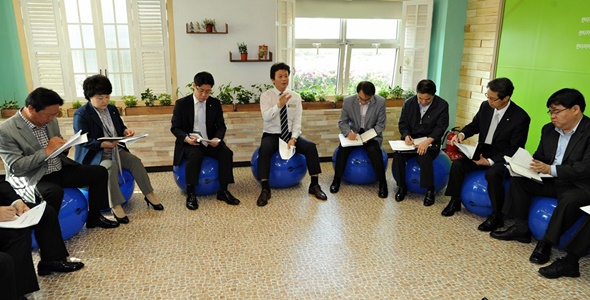 ½Ã´Â ÀÌ¿¡ µû¶ó 4ÀÏ ¿ÀÀü ºû¼Ò¸®¹æ¿¡¼­ ¿­¸° ½ÃÁ¤ ÃÖ°í Á¤Ã¥È¸ÀÇÀÎ ¡®Á¤Ã¥±âȹȸÀÇ¡¯¸¦ Å×ÀÌºí ¾ø´Â ¡®Áüº¼(Gym Ball)¡¯ ȸÀÇ·Î °³ÃÖÇß´Ù. Áüº¼Àº ¸öÀÇ ±ÕÇüÀ» ÀâÀ¸¸ç ½ºÆ®·¹Äª ÇÏ´Â Å« °ø ¸ð¾çÀÇ ¿îµ¿µµ±¸´Ù.