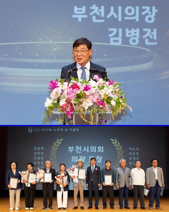 ±èº´Àü ºÎõ½ÃÀÇȸ ÀÇÀåÀÌ 25ÀÏ ¿¸° ¡®Á¦29ȸ ³ëÀÎÀÇ ³¯ ±â³ä½Ä¡¯¿¡¼ Ãà»ç¸¦ Çϰí ÀÖ´Ù. ¾Æ·¡´Â ³ëÀÎ º¹Áö ÁõÁø¿¡ ±â¿©ÇÑ 10¸í¿¡°Ô ÀÇÀå»óÀ» ¼ö¿©ÇÏ°í ±â³äÃÔ¿µÀ» ÇÏ´Â ¸ð½À.(»çÁø= ºÎõ½ÃÀÇȸ Á¦°ø)