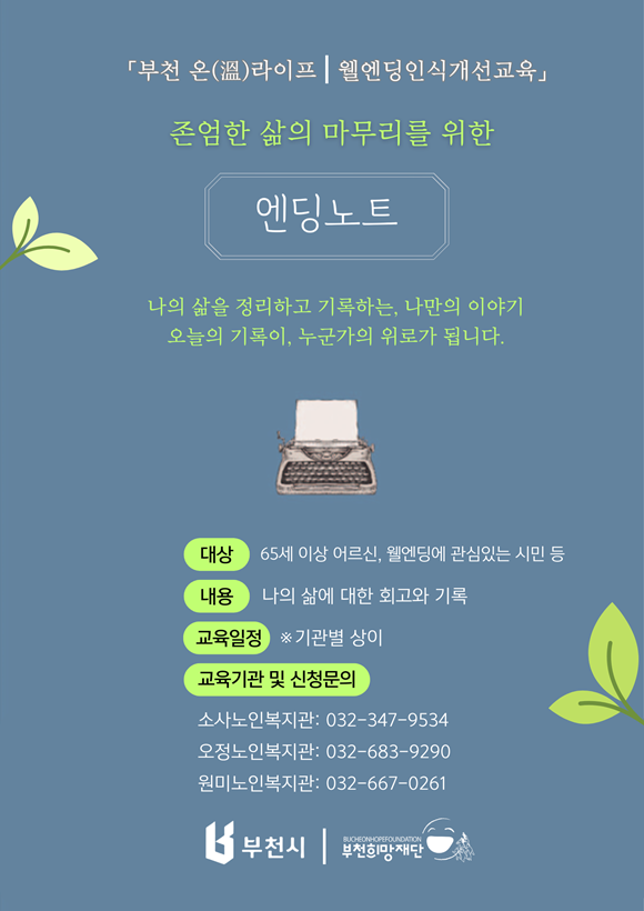 (»ç)ºÎõÈñ¸ÁÀç´ÜÀº ºÎõ½Ã°¡ ÃßÁøÇÏ´Â Àå·ÊÁö¿ø»ç¾÷ ¡®ºÎõ ¿Â(è®)¶óÀÌÇÁ¡¯ÀÇ ÀÏȯÀ¸·Î À£¿£µù(Well-ending) ÀÎ½Ä °³¼± ±³À° ¡®¿£µù ³ëÆ®¡¯ ¿î¿µÀ» ÅëÇØ ºÎõ½Ã¹ÎÀÇ À£¿£µù ¹®È­ È®»ê¿¡ ³ª¼­±â·Î Çß´Ù.