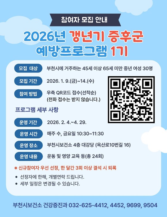 ¿ÃÇØ Á¦1±â ÇÁ·Î±×·¥Àº ºÎõ½Ã¿¡ °ÅÁÖÇÏ´Â 45¼¼ ÀÌ»ó 65¼¼ ¹Ì¸¸ Á߳⠿©¼ºÀ» ´ë»óÀ¸·Î 2¿ù 4ÀϺÎÅÍ 4¿ù 29ÀϱîÁö ¸ÅÁÖ ¼ö¿äÀϰú ±Ý¿äÀÏ ¿ÀÀü 10½Ã 30ºÐºÎÅÍ 11½Ã 30ºÐ±îÁö ÃÑ 13ÁÖ°£ 24ȸ ¿î¿µÇÑ´Ù.