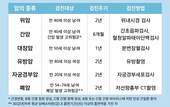 À§¾Ï°ú À¯¹æ¾ÏÀº ¸¸ 40¼¼ ÀÌ»óÀ» ´ë»óÀ¸·Î 2³â¸¶´Ù °ËÁøÇϰí, ´ëÀå¾ÏÀº ¸¸ 50¼¼ ÀÌ»ó¿¡°Ô ¸Å³â ºÐº¯ÀáÇ÷°Ë»ç¸¦ ½Ç½ÃÇÑ´Ù. ƯÈ÷ °£¾Ï°ú Æó¾ÏÀº °íÀ§Ç豺À» ´ë»óÀ¸·Î Çϸç, Á¤±âÀûÀÎ °ËÁøÀÌ ÀÌ·ïÁø´Ù.