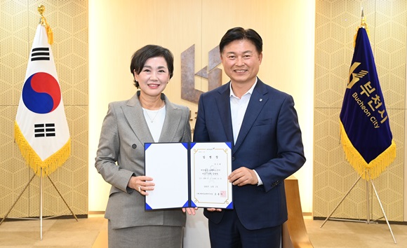 Á¶¿ëÀÍ ºÎõ½ÃÀåÀÌ Áö³ 1ÀÏ ½Ãû 5Ãþ ¸¸³²½Ç¿¡¼ ¹ÚÀºÇý ºÎõ¾ÆÆ®¼¾ÅÍ ´ëÇ¥À̻翡°Ô ÀÓ¸íÀåÀ» ¼ö¿©ÇÏ°í ±â³äÃÔ¿µÀ» Çϰí ÀÖ´Ù.(»çÁø= ºÎõ¾ÆÆ®¼¾ÅÍ Á¦°ø)