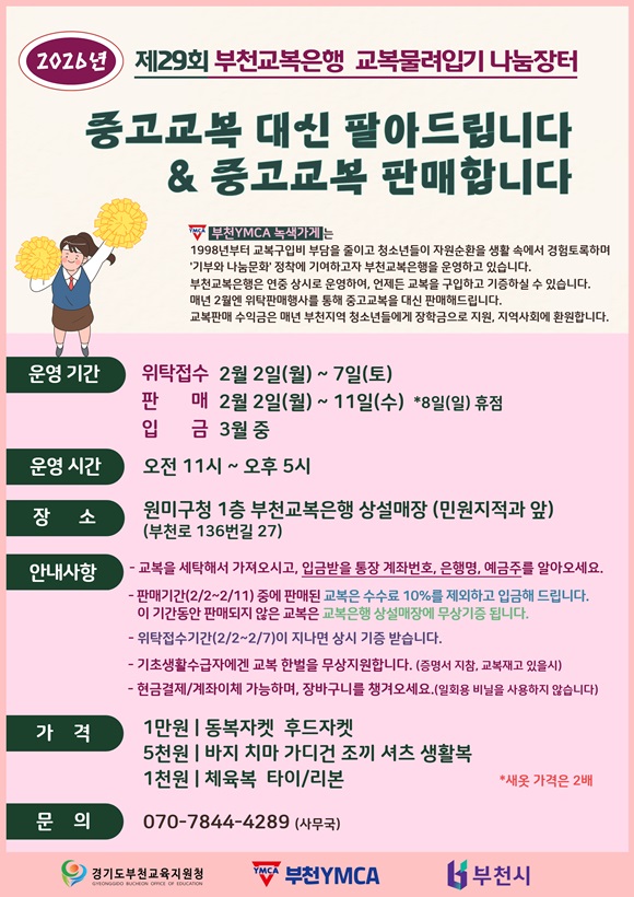 ¡®±³º¹¹°·ÁÀԱ⠳ª´®ÀåÅÍ¡¯´Â ºÎõÁö¿ª 61°³ Áß¡¤°íµîÇб³ ÇлýµéÀÇ ±³º¹ ±âÁõ°ú À§Å¹ÆÇ¸Å·Î ÀÌ·ç¾îÁö¸ç, ÆÇ¸Å¼öÀͱÝÀº Çб³¸¦ ÅëÇØ û¼Ò³â ÀåÇбÝÀ¸·Î ȯ¿øµÅ ÇлýµéÀÌ ±âºÎ¿Í ³ª´®¿¡ Á÷Á¢ Âü¿©ÇÒ ¼ö ÀÖ´Â ÀÇ¹Ì ÀÖ´Â ±âȸ°¡ µÇ°í ÀÖ´Ù.