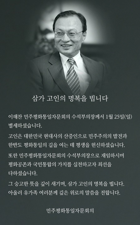 ÀÌÇØÂù ¹ÎÁÖÆòÈ­ÅëÀÏÀÚ¹®È¸ÀÇ ¼ö¼®ºÎÀÇÀåÀÌ 25ÀÏ º£Æ®³²¿¡¼­ Ä¡·á Áß º°¼¼Çß´Ù°í ¹ÎÁÖÆòÅëÀÌ ¹àÇû´Ù. Çâ³â 73¼¼.
