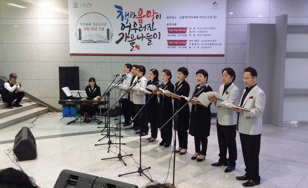 ºÎõ½Ã¸³ »óµ¿µµ¼°üÀº ÁöÇÏö 7È£¼± »óµ¿¿ª»ç¿¡ µé¾î¼± ¡®Ä¢Ä¢ÆøÆø ÀÛÀºµµ¼°ü¡® °³°ü 1ÁÖ³âÀ» ¸Â¾Æ 10¿ù29Àϰú 30ÀÏ ÀÌÆ²°£ »óµ¿¿ª»ç ±¤Àå¿¡¼ ¿ÀÈÄ 7½Ã30ºÐºÎÅÍ ¡®Ã¥°ú À½¾ÇÀÌ ¾î¿ì·¯Áø °¡À» ³ªµéÀÌ¡¯¶õ ÁÖÁ¦·Î ÀÛÀº À½¾Çȸ¸¦ °³ÃÖ, Åð±Ù±æ ½Ã¹Îµé¿¡°Ô Áñ°Å¿òÀ» ¼±»çÇß´Ù. |