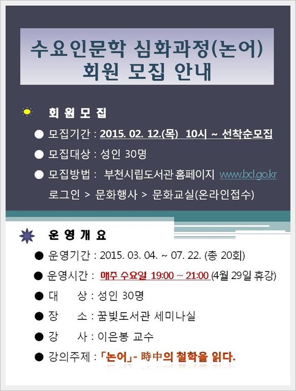 ¶Ç Áö³ÇØ °³¼³µÈ ¡®¼ö¿ä Àι®ÇС¯ ½ÉȰúÁ¤Àº ÀÌÀººÀ ±³¼ö°¡ 3¿ù4ÀϺÎÅÍ 7¿ù22ÀϱîÁö ¸ÅÁÖ ¼ö¿äÀÏ(5¿ù, 6¿ùÀº È¿äÀÏ)¿¡ °øÀÚÀÇ ¡º³í¾î¡»¸¦ ¡®½ÃÁß(ãÁñé)ÀÇ Ã¶ÇÐÀ» Àд١¯¶ó´Â ÁÖÁ¦·Î ½Éµµ ÀÖ°Ô ´Ù·é´Ù.