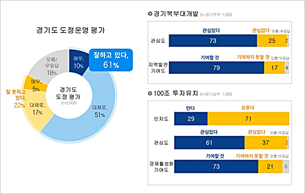 °æ±âºÏºÎ Çö¾È¿¡ ´ëÇÑ °æ±âºÏºÎ µµ¹ÎµéÀÇ ³ôÀº °ü½É°ú ±â´ëµµ È®ÀεƴÙ. ºÏºÎÁö¿ª °ÅÁÖ µµ¹Î 1ÆÝ¸íÀ» ´ë»óÀ¸·Î ½Ç½ÃÇÑ ¿©·ÐÁ¶»ç °á°ú, ¡®°æ±âºÏºÎ ´ë°³¹ß¡¯ »ç¾÷¿¡ ´ëÇØ 73%°¡ °ü½ÉÀ» º¸¿´°í, 79%´Â ºÏºÎÁö¿ª ¹ßÀü¿¡ ±â¿©ÇÒ °ÍÀ̶ó°í ´äÇß´Ù.