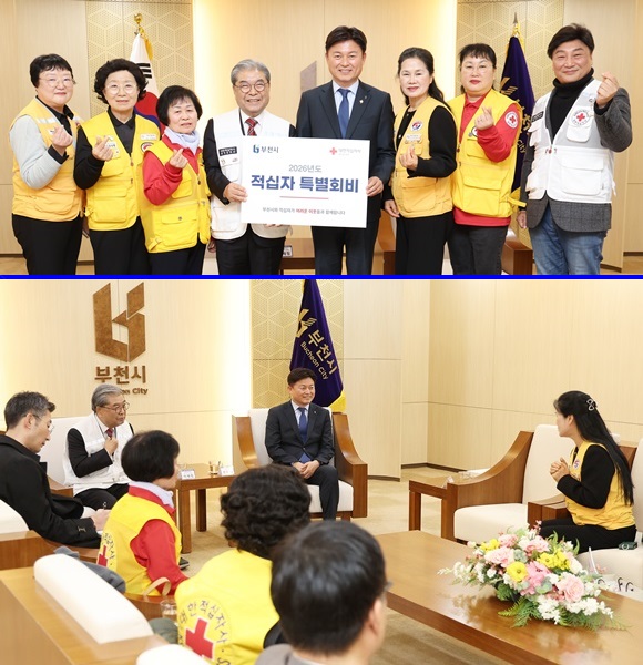 Á¶¿ëÀÍ ºÎõ½ÃÀå(¿À¸¥ÂÊ ³× ¹øÂ°)ÀÌ ÀÌÀçÁ¤ ´ëÇÑÀû½ÊÀÚ»ç °æ±âµµÁö»ç ȸÀå(¿ÞÂÊ ³× ¹øÂ°)¿¡°Ô Àû½ÊÀÚ Æ¯º°È¸ºñ¸¦ Àü´ÞÇÏ°í °ü°èÀÚµé°ú ±â³äÃÔ¿µÀ» Çϰí ÀÖ´Ù. ¾Æ·¡´Â Àü´Þ½Ä ÈÄ ´ëÈ­¸¦ ³ª´©´Â ¸ð½À.(»çÁø= ºÎõ½Ã Á¦°ø)