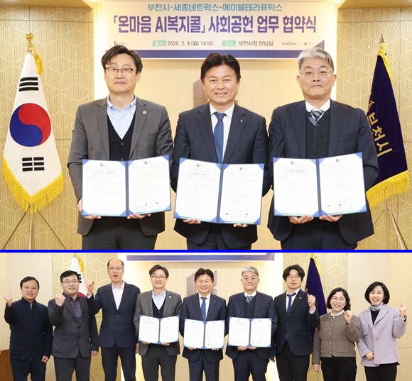 ¹Ú¸íµ¿ ¼¼Á¾³×Æ®¿÷½º ´ëÇ¥ÀÌ»ç, Á¶¿ëÀÍ ºÎõ½ÃÀå, ±èÇüÁØ ¿¡À̺íÅ×ǻƽ½º ´ëÇ¥ÀÌ»ç(¿ÞÂʺÎÅÍ)°¡ ¿Â¸¶À½ AIº¹ÁöÄÝ »çȸ°øÇå Çù¾àÀ» ü°áÇÏ°í ±â³äÃÔ¿µÀ» Çϰí ÀÖ´Ù. ¾Æ·¡´Â Çù¾à½Ä Âü¼®ÀÚµéÀÌ ±â³äÃÔ¿µÀ» ÇÏ´Â ¸ð½À.(»çÁø= ºÎõ½Ã Á¦°ø)
