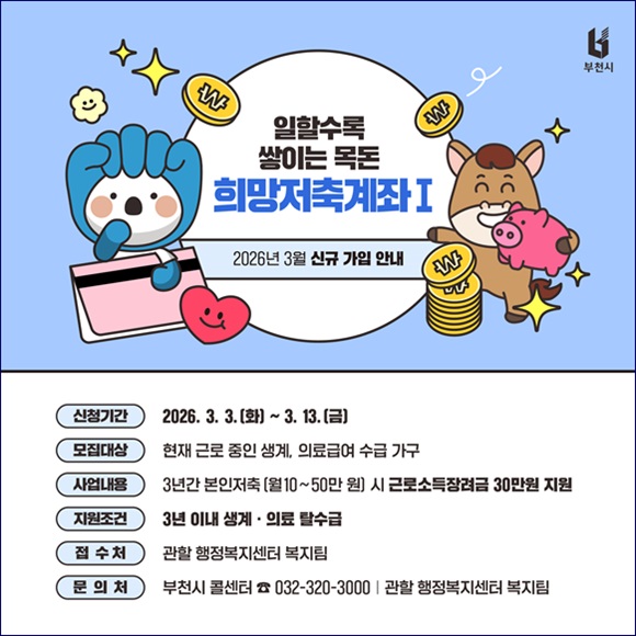 ºÎõ½Ã´Â ±Ù·Î ÁßÀÎ »ý°è¡¤ÀÇ·á±Þ¿© ¼ö±Þ °¡±¸ÀÇ ÀÚ»ê Çü¼º°ú ÀÚ¸³À» Áö¿øÇϱâ À§ÇØ ¡®2026³â Èñ¸ÁÀúÃà°èÁÂ(¥°)¡¯ ½Å±Ô °¡ÀÔÀÚ¸¦ 3¿ù 3~13ÀϱîÁö ¸ðÁýÇÑ´Ù.