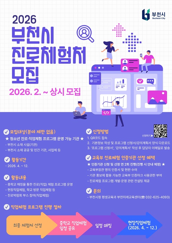 Âü¿©¸¦ Èñ¸ÁÇϴ üÇèó´Â 3¿ù 12ÀϱîÁö ½Åû ¼·ù¸¦ ÀüÀÚ¿ìÆí(sjsj0311@korea.kr)À¸·Î Á¦ÃâÇÏ¸é µÈ´Ù. °ø°í¹®¿¡ ÷ºÎµÈ Æ÷½ºÅÍÀÇ Å¥¾Ë(QR)ÄÚµå(¹Ù·Î °¡±â Ŭ¸¯)¸¦ ÅëÇØ¼µµ °£ÆíÇÏ°Ô ½ÅûÇÒ ¼ö ÀÖ´Ù. ±âŸ ÀÚ¼¼ÇÑ ¹®ÀÇ´Â ºÎõ½Ã Æò»ý±³À°°ú ºÎõ¹Ì·¡±³À°¼¾ÅÍ(0¢Ï32-625-4093)·Î ÇÏ¸é µÈ´Ù.