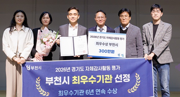 À±Á¾Çö ºÎõ½Ã °¨»ç´ã´ç°ü°ú Á÷¿øµéÀÌ 2026³â °æ±âµµ ÀÚü°¨»çȰµ¿ Æò°¡¿¡¼­ ¡®ÃÖ¿ì¼ö±â°ü¡¯À¸·Î ¼±Á¤µÈ µÚ ±â³äÃÔ¿µÀ» Çϰí ÀÖ´Ù.(»çÁø= ºÎõ½Ã Á¦°ø)