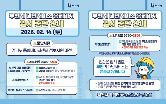 ÇÑÆí, °æ±âµµ ÅëÇÕµ¥ÀÌÅͼ¾ÅÍ ±¸Ãà¿¡ µû¸¥ Á¤º¸Åë½Å¸Á ÀÌÀü ÀÛ¾÷À¸·Î ÀϺΠÇöÀå ¾÷¹«¿Í ȨÆäÀÌÁö µî Àü»ê ¼­ºñ½ºÀÇ Áß´ÜÀÌ ¿ì·ÁµÆÁö¸¸, ºÎõ½Ã´Â ½Ã¹Î ºÒÆíÀ» ÃÖ¼ÒÈ­Çϱâ À§ÇÑ ¼±Á¦ÀûÀÎ °ÇÀǸ¦ ÅëÇØ Áß´Ü ±â°£ÀÌ ´çÃÊ 5ÀÏ¿¡¼­ ȨÆäÀÌÁö 12½Ã°£(14ÀÏ 0½Ã~12½Ã), ¹«Àιοø¹ß±Þ±â 21½Ã°£(14ÀÏ 0½Ã~21½Ã)À¸·Î ´ÜÃàµÆ´Ù.