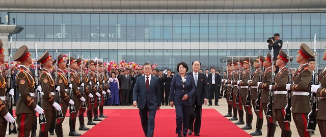 ¹®ÀçÀÎ ´ëÅë·É°ú ±èÁ¤¼÷ ¿©»ç°¡ 20ÀÏ ¿ÀÀü 7½Ã 27ºÐ²² Æò¾ç¼ø¾È°øÇ׿¡¼­ ¹éµÎ»ê ¹æ¹®À» À§ÇØ »ïÁö¿¬°øÇ×À¸·Î ÇâÇÏ´Â Àü¿ë±â¿¡ ¿Ã¶ó Àλ縦 Çϰí ÀÖ´Ù. 2018.9.20 »çÁø= 2018 ³²ºÏ Á¤»óȸ´ã ¿Â¶óÀÎ Ç÷§Æû ĸó