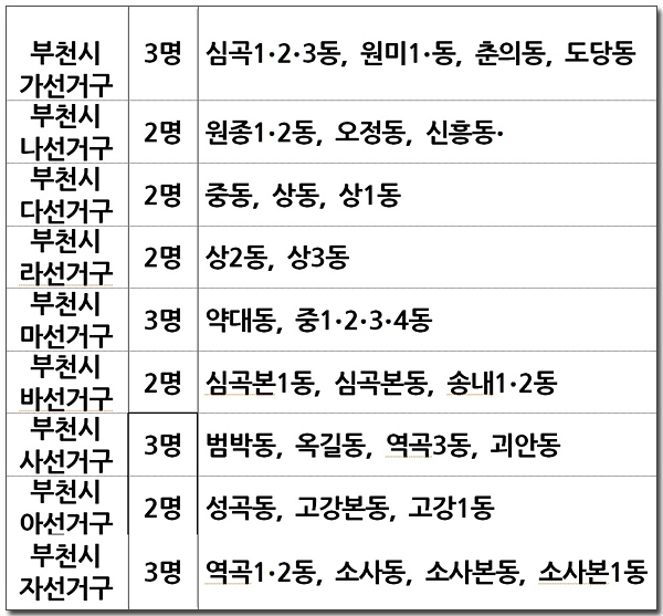 ºÎõ½ÃÀÇ¿ø 10°³ ¼±°Å±¸´Â 9°³ ¼±°Å±¸·Î 1°³ ¼±°Å±¸°¡ °¨¼ÒÇϰí, Áö¿ª±¸ ½ÃÀÇ¿ø Á¤¼ö°¡ 24¸í¿¡¼ 22¸íÀ¸·Î 2¸íÀÌ °¨¼ÒÇÏ°Ô µÈ´Ù.