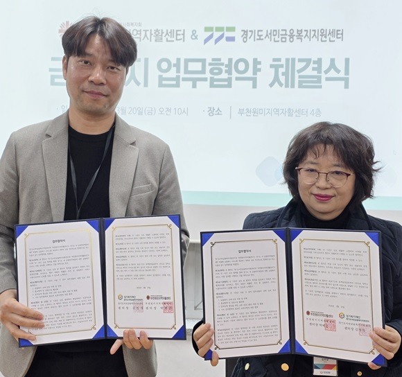 ¹ÚÇýÁØ ºÎõ¿ø¹ÌÁö¿ªÀÚȰ¼¾ÅÍÀå(¿ÞÂÊ)°ú °û°æ¾Æ Çã±×¸¾Çã±×ÀÎ ºÎõ»óµ¿¼¾ÅÍÅÍÀåÀÌ ÀÚȰ»ç¾÷ Âü¿©ÀÚÀÇ Á¤¼­Àû ¾ÈÁ¤°ú ½É¸®Àû ȸº¹À» Áö¿øÇϱâ À§ÇÑ ¾÷¹«Çù¾àÀ» ü°áÇÏ°í ±â³äÃÔ¿µÀ» Çϰí ÀÖ´Ù.(»çÁø= ºÎõ¿ø¹ÌÁö¿ªÀÚȰ¼¾ÅÍ Á¦°ø)