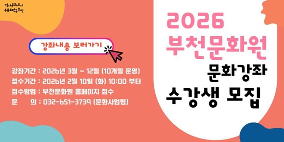 ºÎõ¹®È­¿øÀÌ ¡®2026³â ¹®È­°­Á¡¯ ¼ö°­»ýÀ» ¸ðÁýÇÑ´Ù. ¿ÃÇØ ¹®È­°­Á´ ¹®ÀÎÈ­¸¦ ºñ·ÔÇØ ÃÑ 59°³ °­Á·Π±¸¼ºµÅ 3¿ùºÎÅÍ 12¿ù±îÁö ¿î¿µµÈ´Ù.