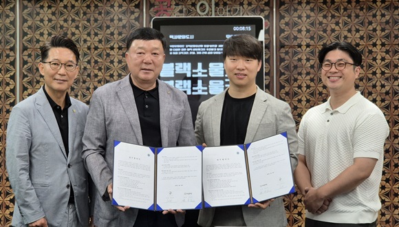 ±Ç¼øÈ£ ºÎõ¹®È­¿øÀå(¿ÞÂÊ)°ú ±è½ÂÁØ BLACKSOUL COFFEE ´ëÇ¥±â 29ÀÏ ºÎõ¹®È­¿ø ³ª¶§TV ½ºÆ©µð¿À¿¡¼­ ¾÷¹«Çù¾àÀ» ü°áÇϰí Çù¾à¼­¸¦ µéµµ ±â³äÃÔ¿µÀ» Çϰí ÀÖµð.(»çÁø= ºÎõ¹®È­¿ø Á¦°ø)